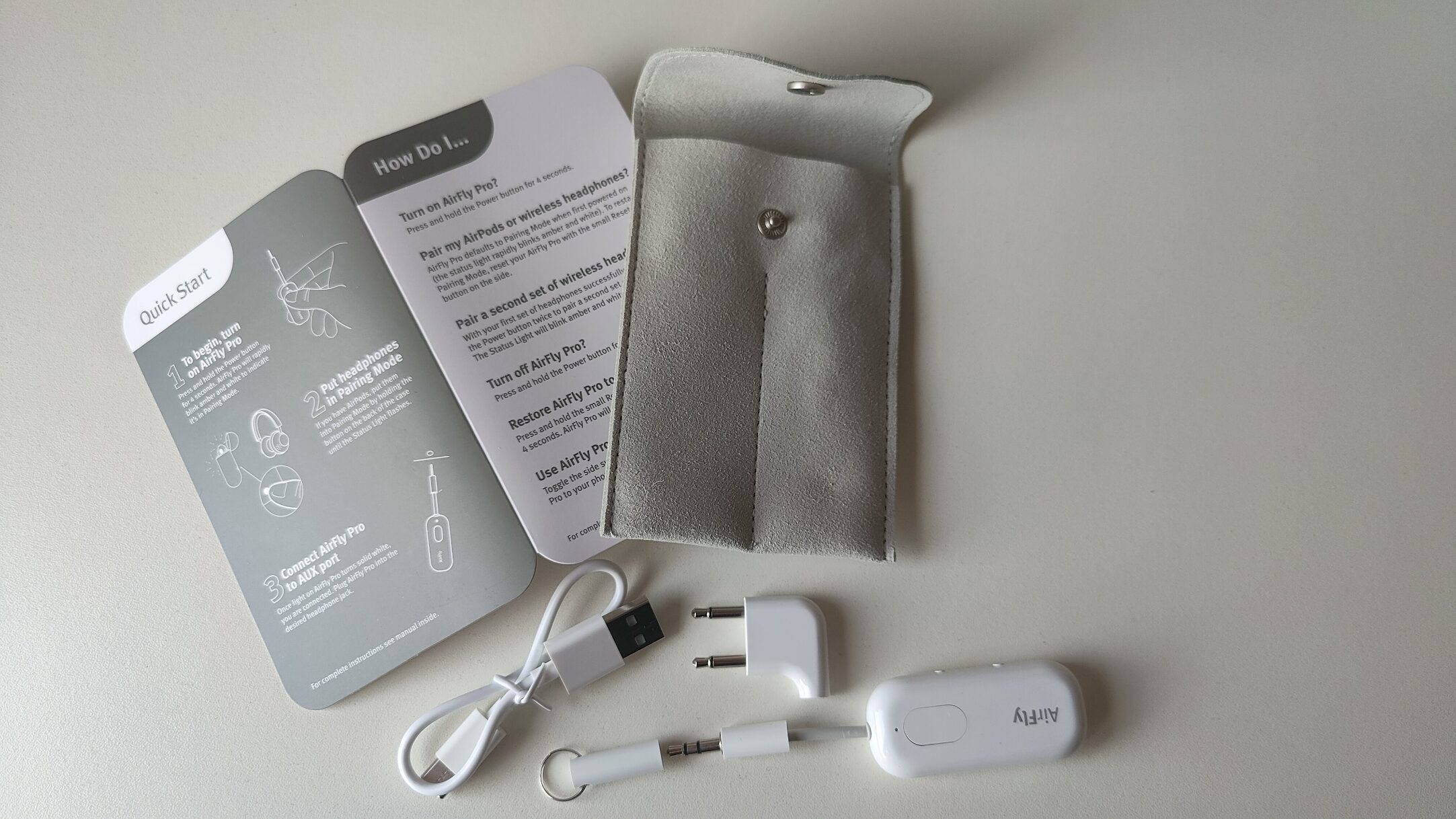 You will find the AirFly Pro, a USB A to USB-C cable, a carry pouch, an airline headphone adapter, and a key ring storage plug in the box.