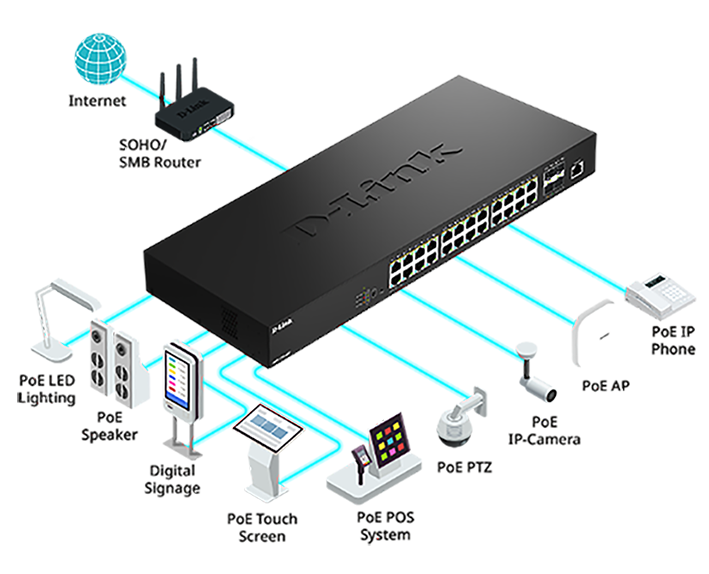 The DMS-1250 Series switchesโ€‹ are versatile and particularly suitable for SMB environments. They provide high-speed data transmission with 2.5GE to desktops and infrastructure devices, whilst providing crucial 10G uplinks for external connectivity. This high-speed uplink ensures that the entire business can access external services without encountering data bottlenecks. Furthermore, they offer IEEE 802.3af/at (PoE/PoE+) to power remote devices.